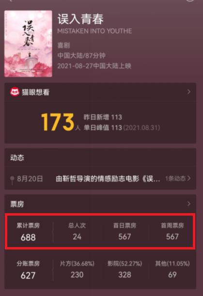 可以看到在8月27日上映一直到发文时间,该片总票房才达到688块钱,观影人数为24,这还是全国的数据,如果真的要算,这24个人甚至坐不满一个小影厅。