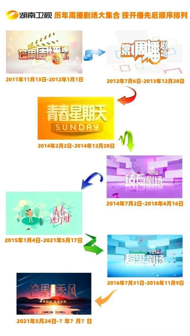 再看周播剧场,从2011年年底起,湖南卫视率先试水周播剧,先后推出了“芒果周播剧场”、“第一周播剧场”、“青春星期天”、“钻石独播剧场”、“超级独播剧场”、“青春进行时”等多个周播剧场,最终“青春进行时”被“芒果季风”所取代。