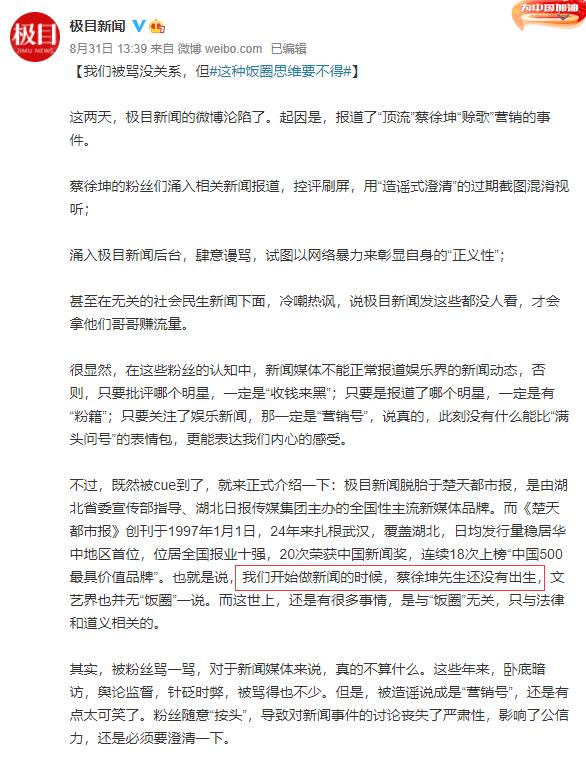再加上现在清朗活动的大力开展,各家公司和经纪人都要求粉丝不要参与或者是评论任何的网络战争,更不要一股脑的为了自家的偶像而盲目地做出一些冲动的行为,网络暴力更是要不得的。在这个节骨眼儿上,蔡徐坤的粉丝却一起出动网爆新闻的官媒,这样的举动着实让很多人吃惊。