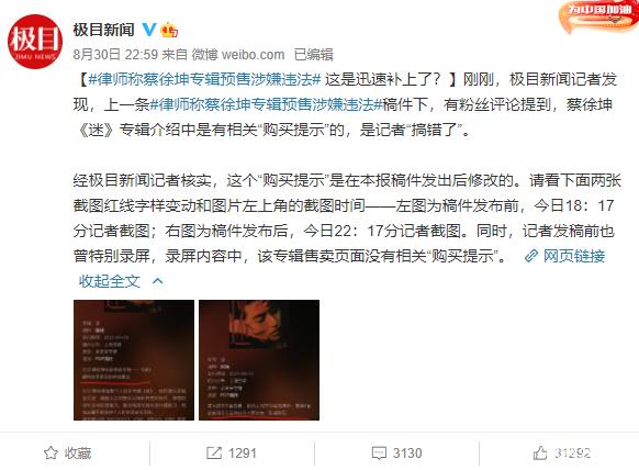 此外,这家媒体还专门咨询了律师。律师表示:由于蔡徐坤在发售专辑的时候,没有在专辑表面写明剩余歌曲需要什么时候发行等字样,这表明他们没有尽到提示的义务,这个行为已经涉及了违法。