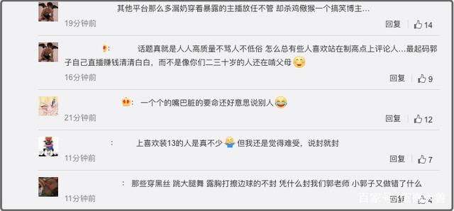 另一类则是郭老师的支持者们,他们认为郭老师被封很冤,还用那些打擦边球的主播们举例,认为她们比郭老师更应该被封禁。