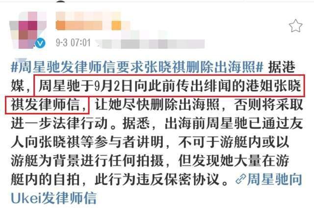 9月3日,59岁的周星驰与17岁港姐的“恋情绯闻”迎来后续,周星驰向绯闻女主角张晓祺发出律师信,要求对方尽快删除出海照,并且透露早在共同出行之前,周星驰就已经同张晓祺达成了不准透露出行照片的口头协议,直指对方违反了保密协议。