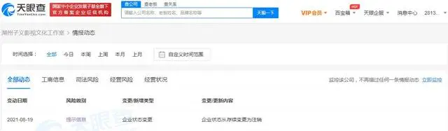 8月19日消息,湖州子义影视文化工作室发生工商变更,企业状态由存续变更为注销。