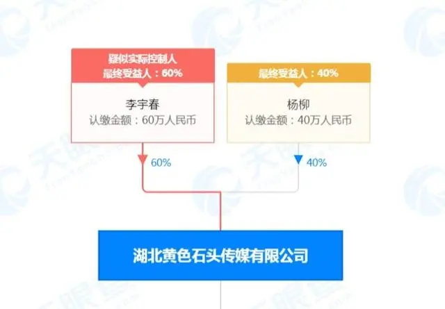 7月20日,湖北黄色石头传媒有限公司经营状态由存续变更为注销,该公司成立于2017年2月,法定代表人为杨柳,注册资本100万人民币,经营范围包括组织文化艺术交流活动;广播电视节目制作;电影发行;电影摄制;演出经纪;影视剧、影视策划等。股东信息显示,李宇春为该公司大股东及实际控制人,持股比例60%。