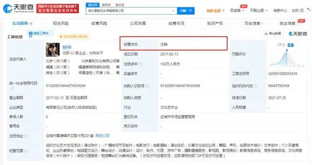 8月19日,据企查查APP显示,刘雨昕关联公司上海乐谐文化传媒工作室注销。该公司成立于2018年,法定代表人刘雨昕,注册资本10万元人民币,经营范围包括文化艺术交流策划,影视策划,电影制片,电影发行,广播电视节目制作等,由刘雨昕全资持股。