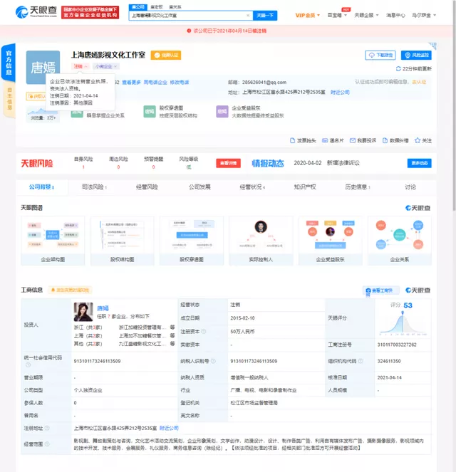 4月14日,唐嫣关联公司上海唐嫣影视文化工作室、文章关联公司上海路路影视文化工作室注销,相关注销工作室均由艺人本人全资持股。