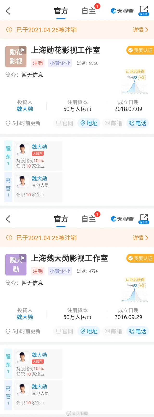 4月26日,上海魏大勋影视工作室和上海勋花影视工作室发生工商变更,企业状态从存续变更为注销,注销原因均为其他原因。值得一提的是,此前,魏大勋曾退出吉林市洪利森房地产开发有限责任公司股东行列。上海魏大勋影视工作室成立于2016年9月,上海勋花影视工作室成立于2018年7月,两公司注册资本均为50万人民币,经营范围均涉及影视剧、舞台剧策划与咨询;演出经纪、文化艺术活动交流策划;影视文化领域内的技术开发、技术服务等。股东信息显示,两公司法定代表人、唯一股东、最终受益人同为魏大勋。