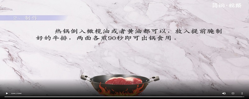 将橄榄油或黄油倒入锅中,加入事先腌制好的牛排,两面煎90秒后即可食用。