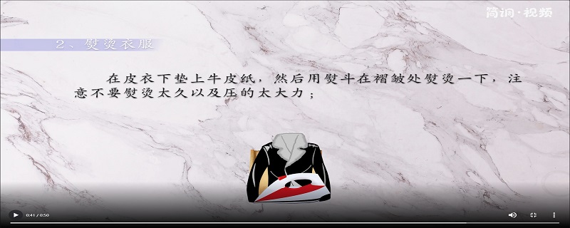 你不能用熨斗直接在表面熨烫起皱的皮衣。我们要先在皮衣表面铺一张光滑的牛皮纸,皮衣下面放一个专用的熨烫袋。然后,把熨斗调到75左右,先在折痕处熨烫。注意压力和时间,不要在一个地方停留太久,时刻注意皮衣的状态。展平后,挂在通风处晾干。