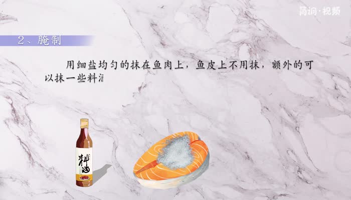 将细盐均匀地涂在鱼上,但不要涂在鱼皮上。你可以额外在鱼上加点料酒。