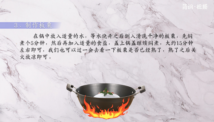 锅中放入适量的水,水开后倒入洗净的栗子,小火炖5分钟,然后加入适量的盐,盖上锅盖继续小火炖15分钟左右。我们也可以过一段时间检查一下栗子是否熟了,然后关火,晾凉。