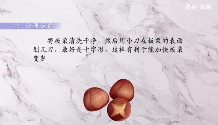将板栗清洗干净,然后用刀在板栗表面刮一下,最好是十字形状,这样可以加快板栗的成熟速度;