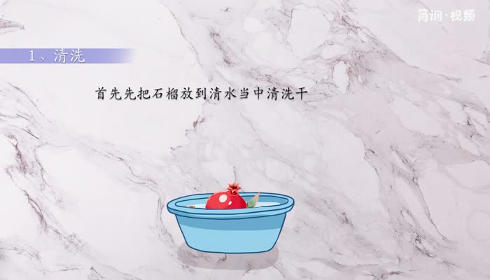 先将石榴放入清水中清洗干净,准备一把刀,将石榴的头尾切掉;