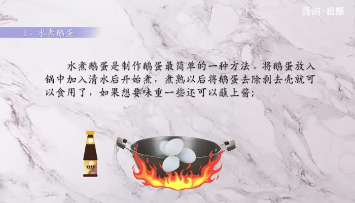 煮鹅蛋是做鹅蛋最简单的方法。将鹅蛋放入锅中加水开始煮。煮熟后,取出鹅蛋,剥去蛋壳,即可食用。如果想口味重一点,可以蘸酱油一起吃。