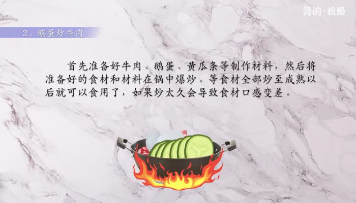 先准备好牛肉、鹅蛋、黄瓜条等食材,然后将准备好的食材和材料放入锅中翻炒。所有食材炒至成熟后,即可食用。如果炒太久,食材的口感会变差;