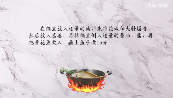 锅里放适量油,先爆香花椒和大料,再放入葱和姜,然后往锅里倒入适量酱油和盐,再放入黄鱼,盖上锅盖煮15分钟左右。