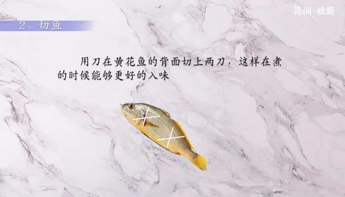 用刀在黄花鱼背上划两刀,这样煮的时候味道更好,让味道渗透到鱼里面,然后切葱姜备用;