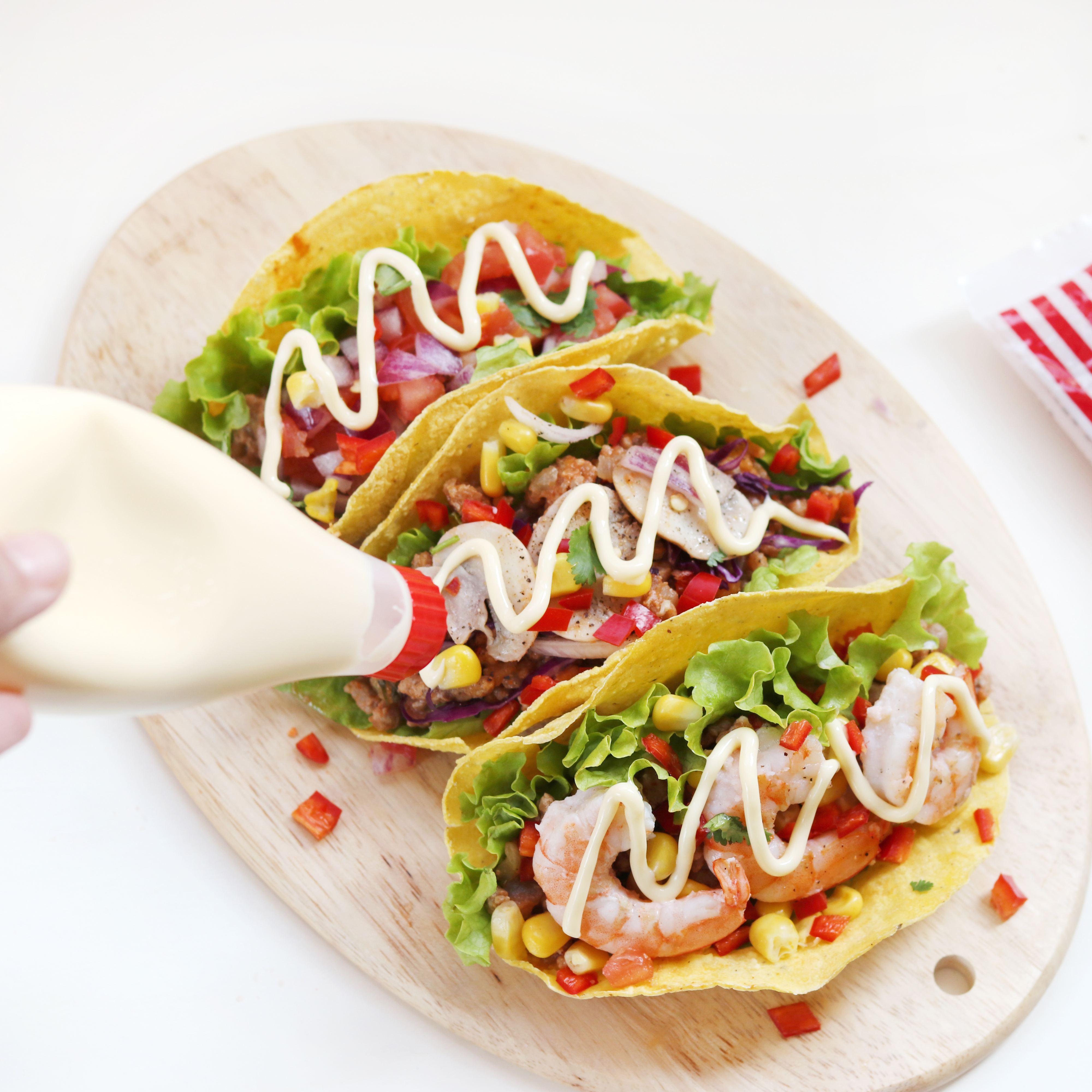 沙拉酱味道清淡,基本是蛋清的味道,还有甜沙拉酱。千岛酱里有酸黄瓜,吃起来酸酸的。