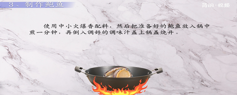 用中、小辣料,然后将准备好的鲍鱼放入锅中炸一分钟,然后倒入准备好的酱料,盖上锅盖煮开。然后把酱汁晾干,用香菜翻炒。