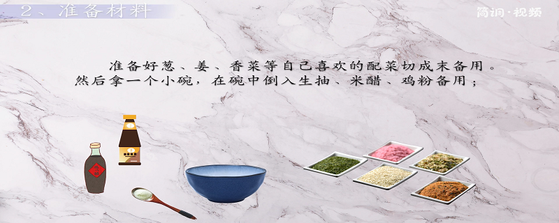 准备葱、姜、香菜等喜欢的配菜,切成块备用。然后取一个小碗,将酱油、米醋、鸡粉倒入碗中备用;
