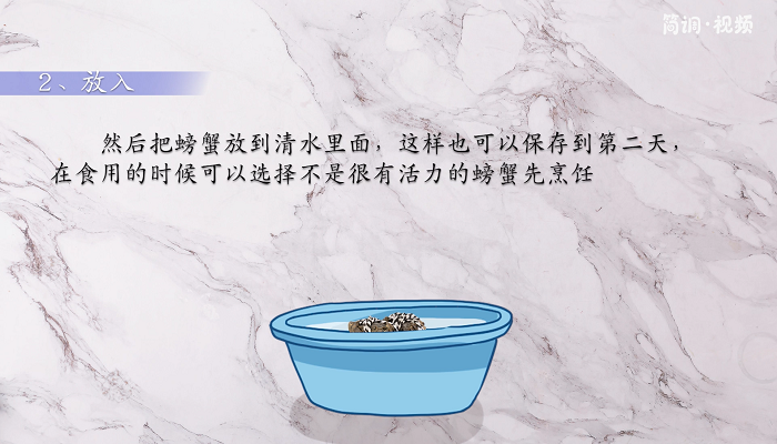 然后把螃蟹放在干净的水里,这样可以保存到第二天。吃的时候可以选择精力不太旺盛的螃蟹先煮。