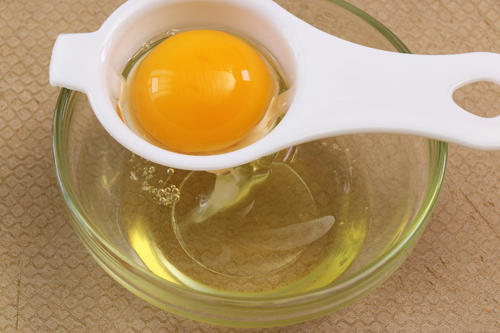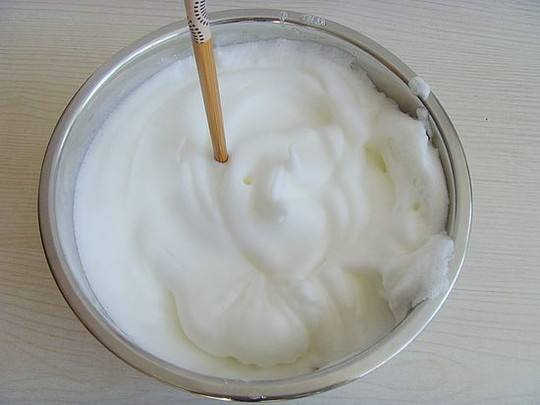 先把蛋清和蛋黄分开,取3-4个蛋清,加入一些白糖,用3根筷子同方向一起搅拌,时快时慢,这样奶油更细腻。