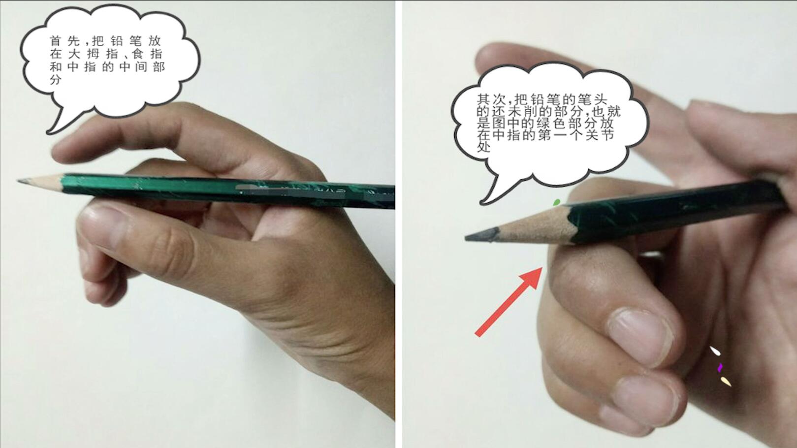 其次,我们把铅笔尖不成形的部分,也就是图中绿色的部分,放在中指的第一个关节上。