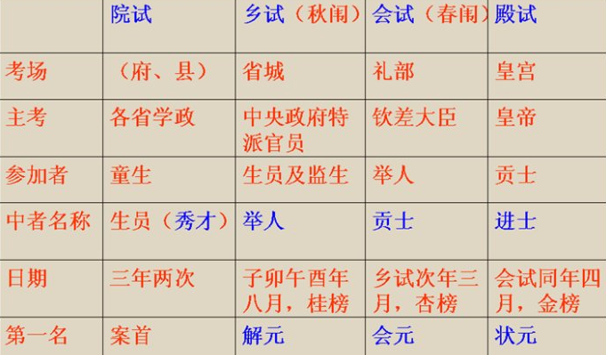 殿试是科举考试中最高的一段。县考府考书院考乡试会考宫考,通过者称为:童生圣元(秀才)举人贡士进士。进宫考试填表后,皇帝在太和殿举行仪式宣布进宫考试的结果。进士分前三名。一个或者三个人,分别叫一号,二号,二号。