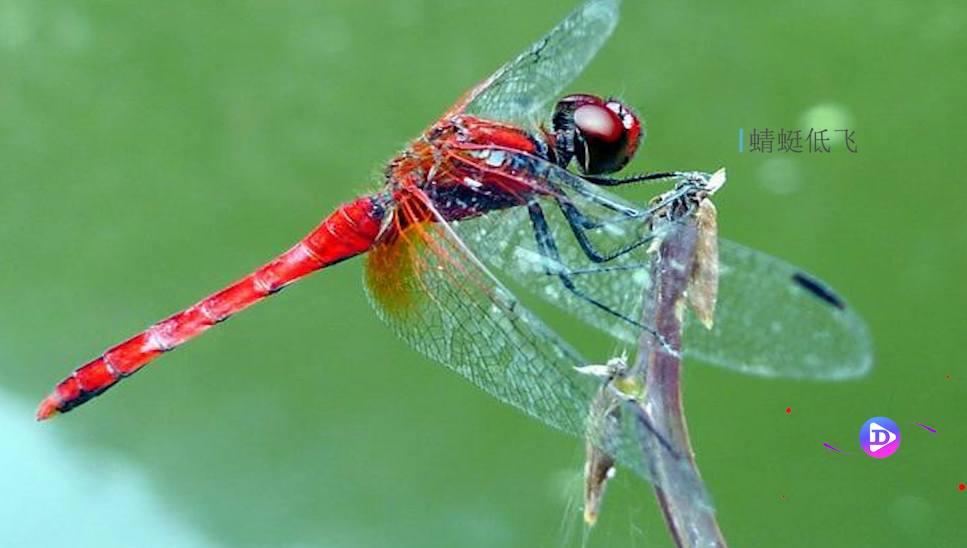 通常在下雨之前,空气中的湿度是相当高的,但蜻蜓飞行时,遇到潮湿的水汽,往往会弄湿翅膀;这是蜻蜓捕捉猎物的好时机,可以看到蜻蜓飞得很低。