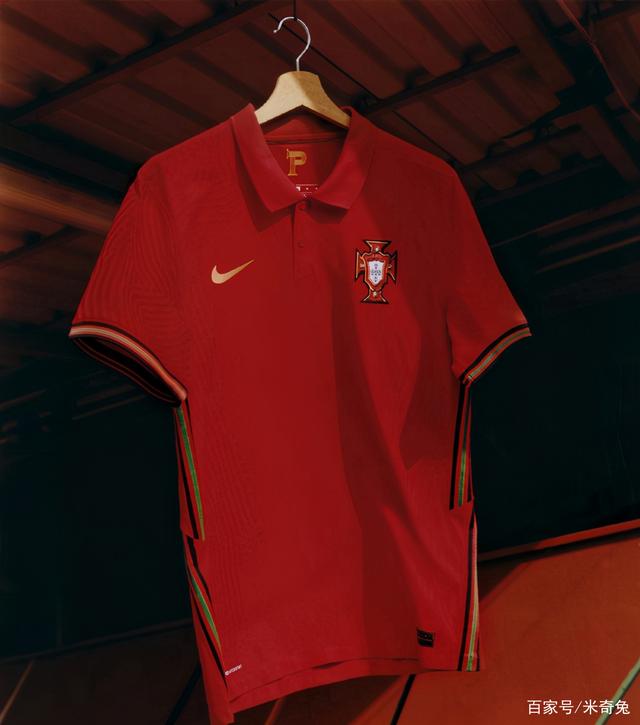 萄牙队传统的红绿色主场球衣以金色点缀,翻领的设计赋予球衣精致的质感。