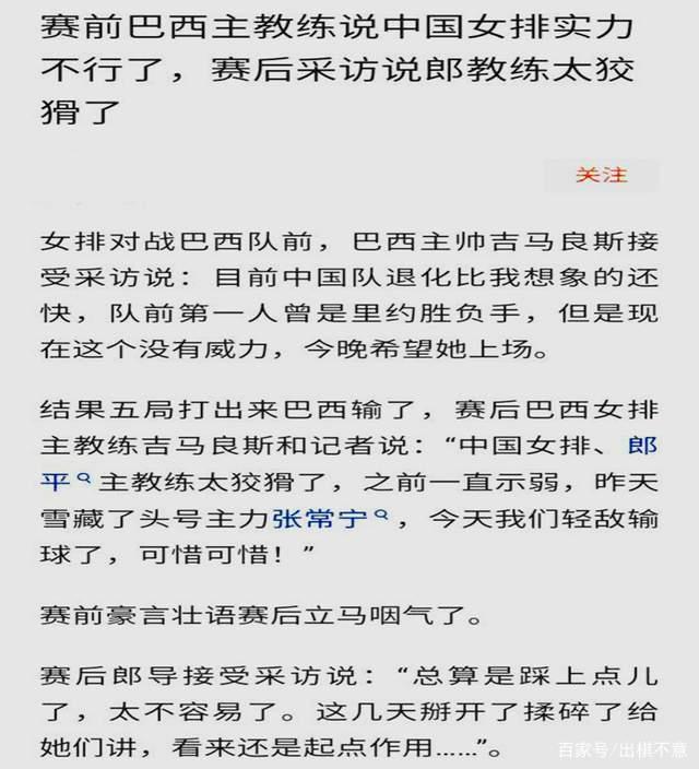 曾经在赛前豪言壮语的巴西队教练在输掉比赛后和记者说:“中国女排郎平主教练太狡猾了,之前一直示弱,昨天还雪藏了头号主力张常宁,今天我们轻敌输球了,可惜可惜!”