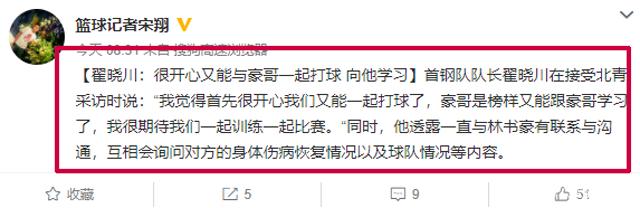 同样的,作为北京男篮的队长,翟晓川也是在网络上表示:“我觉得首先很开心我们又能一起打球了,豪哥是榜样又能跟豪哥学习了,我很期待我们一起训练一起比赛。”同样的,翟晓川还直言,自己一直跟林书豪保持沟通,也会询问他的伤病情况,当然,对方也会问自己这些事情。这样的翟晓川,他与林书豪之间,应该也是建立起一定的友谊的。不然的话,彼此之间不会如此熟悉。