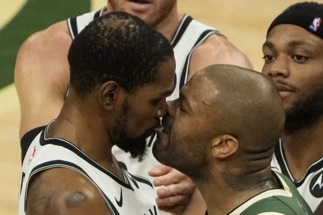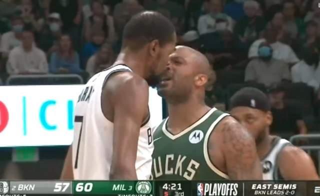 不过当篮网逐渐稳住阵脚之后,雄鹿那单一的进攻手段还是很容易被篮网给限制住。第二节篮网如法炮制,还了一个31比15将分差追至一分。易边再战,由于双方命中率都极低,比赛非常激烈,每个回合都是在拼刺刀的感觉,两边的火药味也逐渐燃了起来。第三节末段,PJ-塔克在一次防守杜兰特的回合中被吹了犯规,他对裁判表示不满的时候杜兰特跑过来冲他喷了几句垃圾话,瞬间引爆了这个火药桶。只见塔克冲到杜兰特面前贴脸输出,与KD互喷垃圾话,那场面把三个裁判都吓到了,赶忙将两人拉开,避免了更大的冲突发生。慢镜头显示,两人面部贴得非常近,就差嘴对嘴了,而裁判也是各打了五十大板,一人给了一个技术犯规。