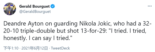 首先是艾顿在赛后的采访中,谈到约基奇全场交出大号三双,艾顿非常老实地表示,自己一直有努力防守,已经尽力了,真的已经拼尽全力了。