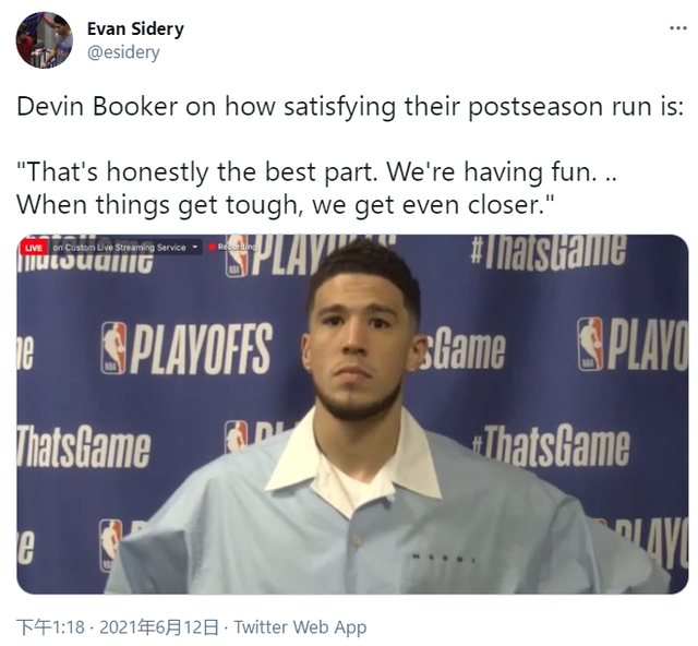 布克表示艾顿季后赛至今,一直打得都非常努力,从防守顶级球员浓眉哥,到面对MVP约基奇,艾顿都交出了不错的表现,也一直都非常努力。