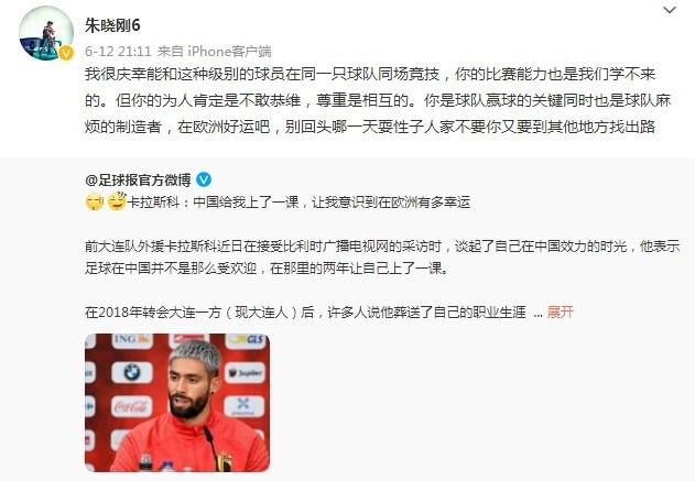 直播吧6月12日讯 近日卡拉斯科在采访中谈到了在中国的踢球经历。他的言论引起了前大连队友朱晓刚的不满。