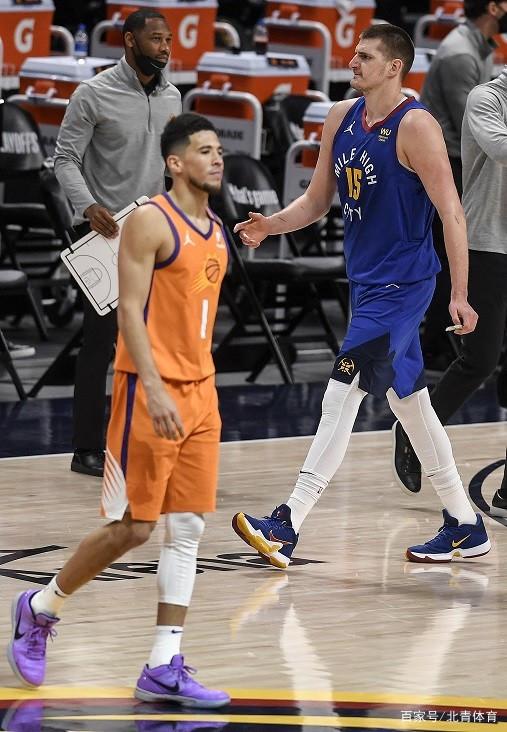 比赛打成这样,最值得同情的就是掘金队的常规赛最有价值球员尼克拉·约基奇了,他在赛前于主场观众面前领取了MVP奖杯,受到了球迷们的膜拜,当然也受到了包括对手球员的祝贺。只是,奖杯再好,个人荣誉再高,也抵不过球队输球和此轮系列赛一胜难求带来的耻辱。或许是奖杯的颁发刺激了对面阵营的球员,太阳又是呈现了一次首发全员得分上双、全队10人有得分入账的表现,打得掘金一点儿脾气也没有。