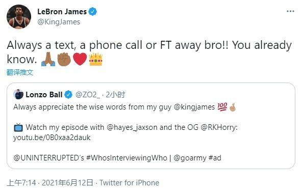 今日,鲍尔在个人推特发文再次感谢詹姆斯:“总是很感激,那些来自我哥们儿的睿智话语。”