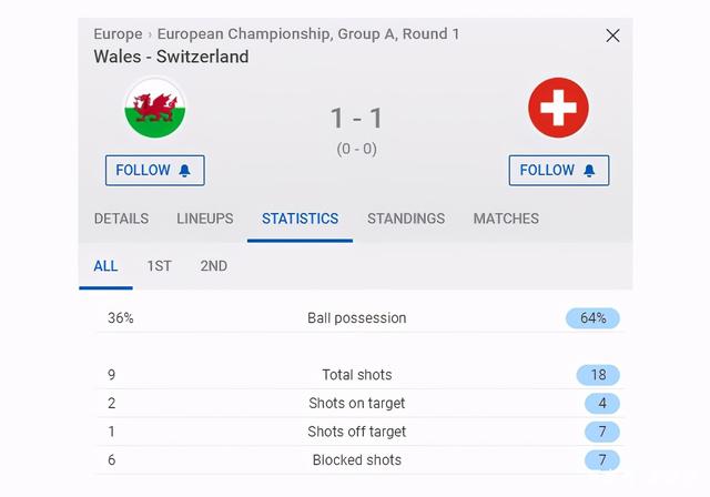 本场比赛瑞士人占据了64%的控球优势,射门数也是翻倍于威尔士(18-9)。不过一名高中锋带来的头球优势改变了比赛的结果(本场威尔士一共2次射正球门,都是来自于摩尔的头球),摩尔职业生涯至今一共为威尔士打入6球,其中4个来自于头球。值得一提的是,威尔士最近4粒欧洲杯进球,有3个是通过角球战术完成。