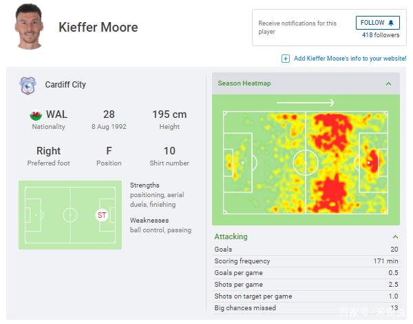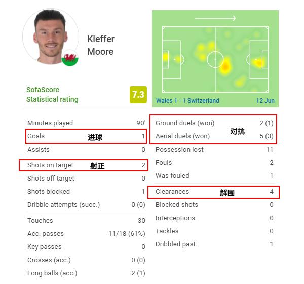 在无缘中国男足之后,摩尔反倒是被威尔士国家队选入阵中,出战了欧洲杯预选赛。在刚刚过去的2020-21赛季里,摩尔代表英冠卡迪夫城出战42场打进20球,位居射手榜第四。本场与瑞士的比赛,主打4141阵型的威尔士让摩尔出现在突前中锋的位置,他也交出了一份完美的答卷。
