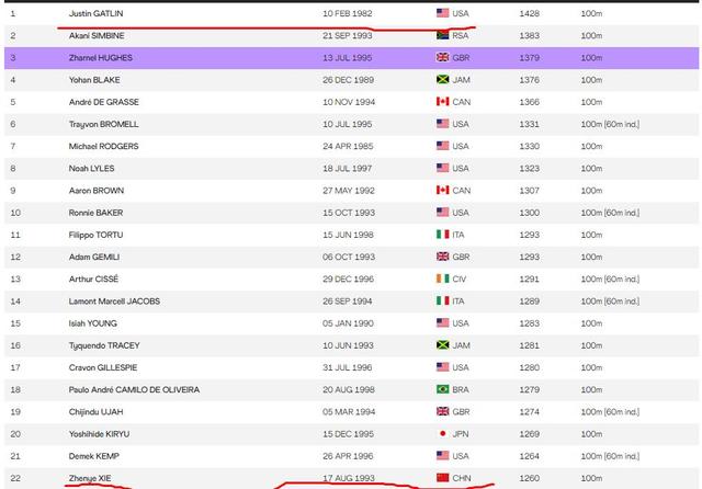 最近,世界田联更新了最新一期男子100米运动员排名,亚洲飞人苏炳添由上一周世界第52名下降2位到了54位,谢震业则依然排名第22位,榜首是39岁传奇名将加特林,美锦赛选拔赛在即,加特林如果能够在美锦赛中进入前三,凭借他的大赛经验必将成为东京奥运会百米夺冠热门选手。