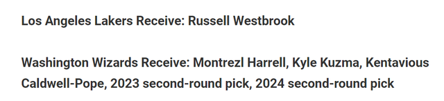 潜在交易方案:湖人送出哈雷尔(执行球员选项)+库兹马+波普+2023年和2024年二轮签,从奇才队得到威少。