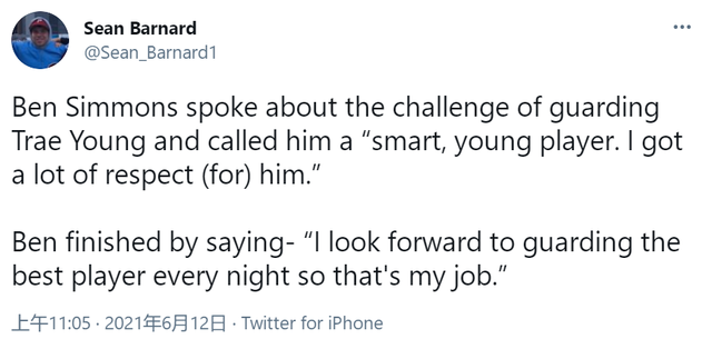 随后本西蒙斯在赛后的采访中谈到特雷杨,表示他是一名聪明的年轻球员,自己很尊重他,自己每个夜晚都期待去防守对方最好的球员,这是自己最爱的工作。