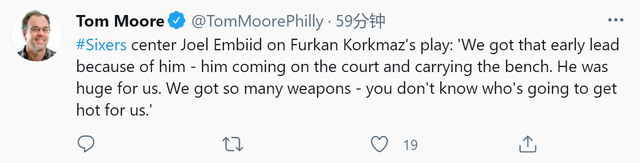 兴奋的恩比德也在赛后通过社媒再次放豪言,恩比德写道:“没什么能够让我倒下,我会继续战斗下去#相信过程”