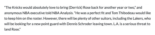 “尼克斯绝对希望留下罗斯”一位匿名高管告诉记者,“他非常适合球队,锡伯杜会希望将他留在球队阵中,然而还有其他球队对他感兴趣,这其中就包括湖人,他们会在丹尼斯-施罗德离开后寻找一名新的后场球员,湖人会有机会得到罗斯。”