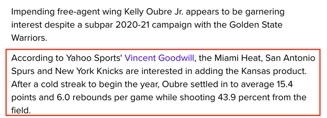 据雅虎体育记者文森特-古德维尔的说法,像热火,马刺和尼克斯等球队都对乌布雷感兴趣,在过去这个赛季,乌布雷是场均能得到15.4分和6篮板数据表现的球员。