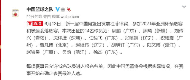 本次男篮备战连续遇到伤病的困扰,男篮出征菲律宾的14名球员确定,孙铭徽、于德豪、高诗岩和王泉泽最终因伤病和阵容需要的原因无缘出征,这其中孙铭徽受伤,高诗岩支援三人国家队,最终的14人名单如下: