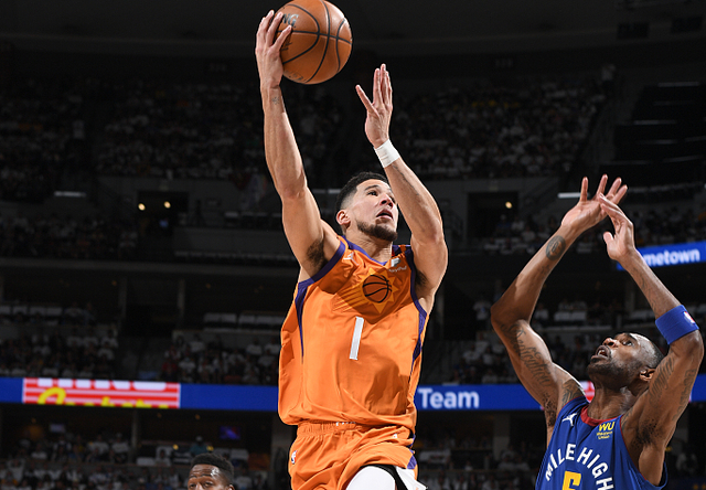 进入节中,布克开始发威,中投三分样样都有,太阳首节比赛就掀起进攻浪潮,单节轰出了37分,第一节比赛他们已经取得了10分的领先优势。次节比赛,莫里斯的外线三分,揭开第二节比赛序幕。掘金队在这节开始反扑,替补众将齐发力,约老师自然也不赖,他们在第二节追回8分,拉回悬念。布克的手感冰凉,第二节比赛仅仅5投1中。半场战罢,两队比分太阳59-55掘金。