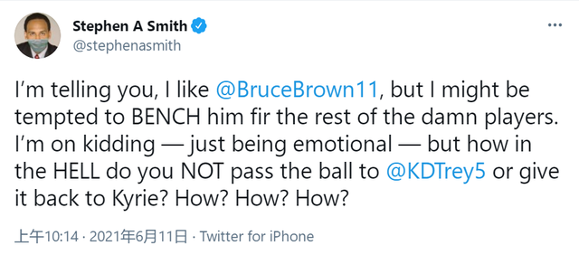 A-史密斯写道:“实话实说,我真的喜欢布朗,但是我可能以后都会把他按在板凳上,当然,我是在开玩笑,但从感性的角度来说,那种关键时刻,你TM为为什么不把球传给KD或者欧文?为什么?为什么?为什么?”