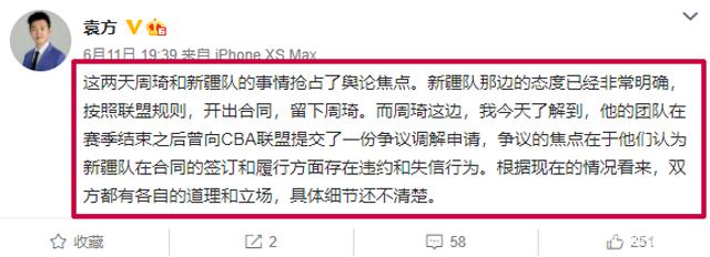 这般现实下,名记袁方爆料,“这两天周琦和新疆队的事情抢占了舆论焦点。新疆队那边的态度已经非常明确,按照联盟规则,开出合同,留下周琦。而周琦这边,我今天了解到,他的团队在赛季结束之后曾向CBA联盟提交了一份争议调解申请,争议的焦点在于他们认为新疆队在合同的签订和履行方面存在违约和失信行为。根据现在的情况看来,双方都有各自的道理和立场,具体细节还不清楚。”